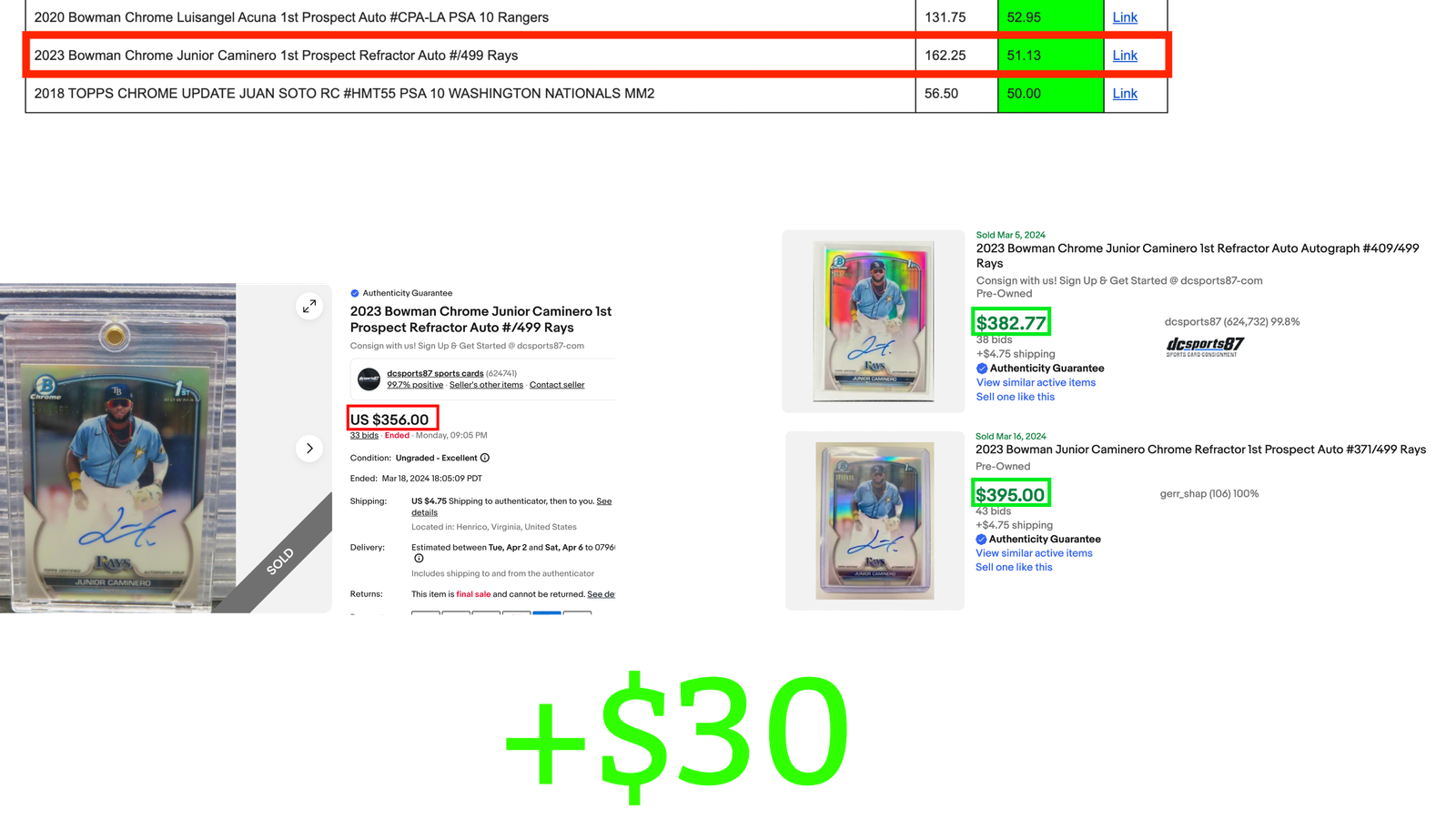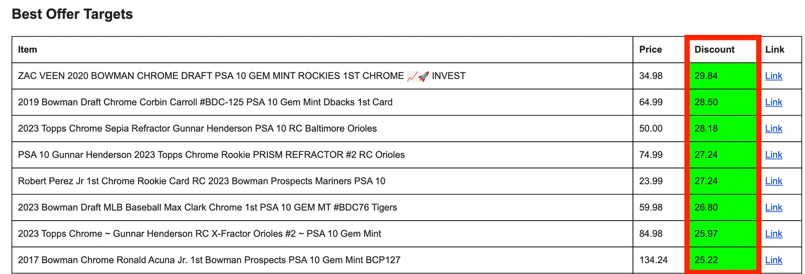 We ran our service for a week and compiled all of the emails it sent out. We calculated the value generated by each target by finding the amount it is discounted from our generated price. The total value generated by best offer and buy now targets for the week was $3,925.57. Since we tested our algorithm with only 132 tracked cards, we divided that total value by 132 and then 7 to get a total value generated per card per day of $5.32. Since our full version tracks 275 cards and our subscriptions last for 30 days, we multiplied the total value generated per card per day by 275 and then 30 to get a total monthly value of $43,893. To account for possible error in our pricing model, we divided that total monthly value by 2 to get a more realistic value/month number of $21,946. We then assumed that each customer should be able to extract at least 0.5% of the monthly generated value, resulting in the best offer and buy now feature providing $109.73 of value to each customer.